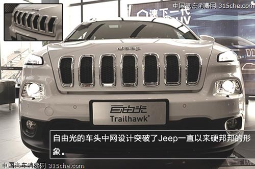 新Jeep自由光的外觀觀變得十分有動感,Jeep家族獨有的七孔格柵在自由光上仍舊存在,但是自由光卻放棄了以前Jeep進氣孔方方正正的設計,轉而將前進氣孔改成了月牙般的彎曲,這種設計在Jeep家族的其它車型上是從未有過的。