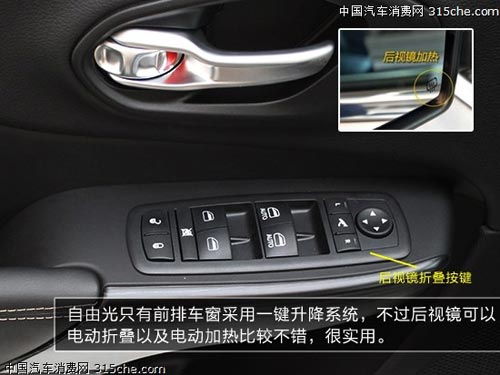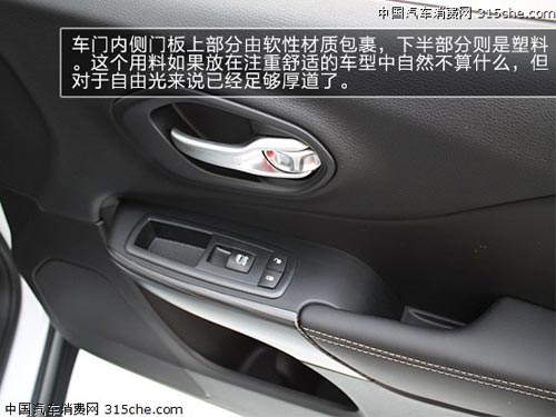 車內側門板上部分均由軟性材質包裹,下半部分則是硬塑料。如果與德系相比,沒有什么太多可以說的,材質一直就不是Jeep的強項,不過這些年Jeep對內飾選材和做工一直都在改進,比如牧馬人,這也是我們樂于看到的。自由光用料給我的感覺還是不錯的。特別一提是在做工方面,自由光至少是不遜色于大切諾基的,比Jeep其他任何一款車都要好。