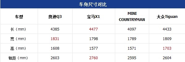 Q3在同級別里并不是尺寸最大的,但卻是尺寸比例最正常的。X1雖然軸距比較長,但是車身太矮,太接近轎車了,所以空間沒有Q3來得那么實用。而源于同平臺的大眾Tiguan雖然車內空間更加實用,但是從外形來說又沒有Q3那么年輕時尚。至于MINI CUNTRYMAN,在外形上,可能沒有人可以阻擋它的魅力,但是這個車在實用性上是一個非常大的短板。總的來說,奧迪Q3是實用和外觀上的取舍非常均衡的一輛車。