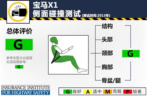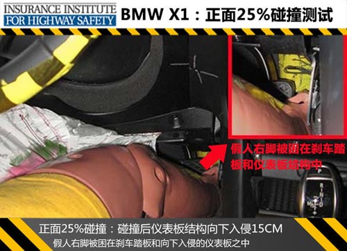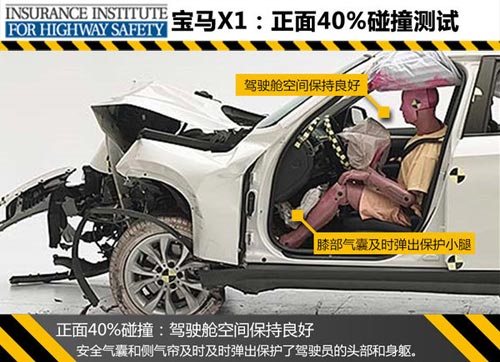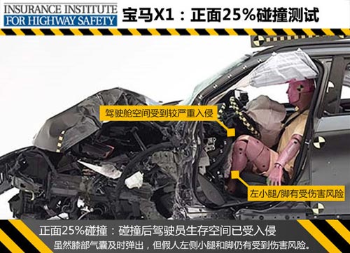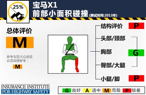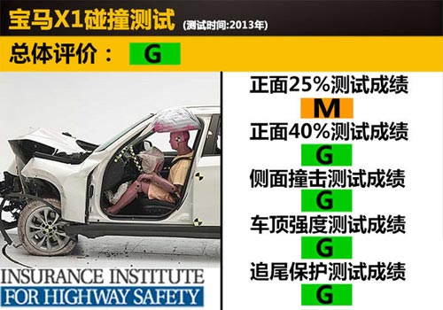 在豪華SUV領域,寶馬X1開創了先河,率先進入緊湊SUV細分市場。即使在奧迪Q3、奔馳GLA等競爭者紛紛加入之際仍然沒有換代的跡象。日前這款新車型在美國進行了碰撞測試,網通社查閱相關資料后發現此車的正面40%碰撞測試、側面碰撞測試、頂部碰撞測試以及頸部保護測試這4大項總成績均為最高級別“G”(良好),但正面25%測試的成績是“M”(危險),車內模擬駕駛員假人的左側小腿和腳有受到傷害的隱患。