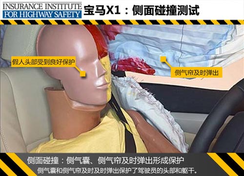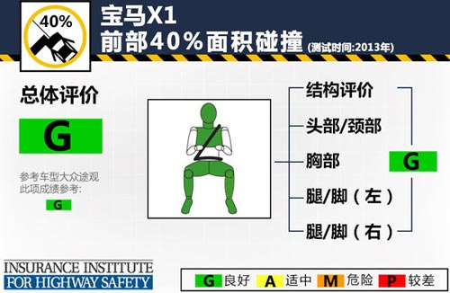 寶馬X1在正面40%碰撞測試中,正面安全氣囊和側氣簾及時彈出充分的保護了駕駛員頭部,碰撞后A柱無明顯變形,駕駛艙空間保持完整,膝部安全氣囊的彈出也對駕駛員的小腿和膝部形成良好保護。X1的這項測試總成績以及其中各項成績均為“G”良好,車內乘員的身體各部位均受到良好的防護。大眾途觀在這項測試中也同樣取得了優異的成績,對車內人員的保護充分到位。