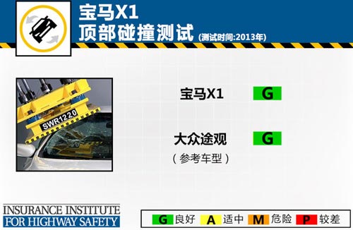 頂部碰撞主要測試車輛發生翻滾時車型結構的變化,成績可反映出側翻時車身結構的安全性,在這項測試中寶馬X1和大眾途觀均取得了良好的成績,為車內乘員提供充分的保護。