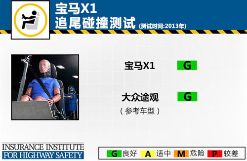 頸部保護測試是模擬追尾碰撞時座椅對車內乘員頸部的保護,在這項測試中2車的座椅和頭枕均可以為車內乘員提供充分的防護,避免頸椎過度屈伸的損傷。此項測試中寶馬X1和大眾途觀的成績均取得了“G”(良好)的理想成績。