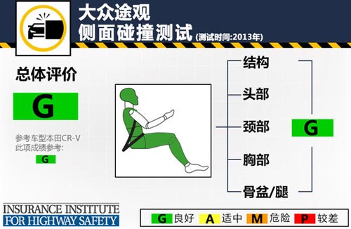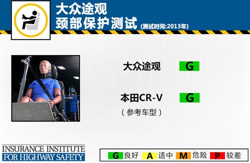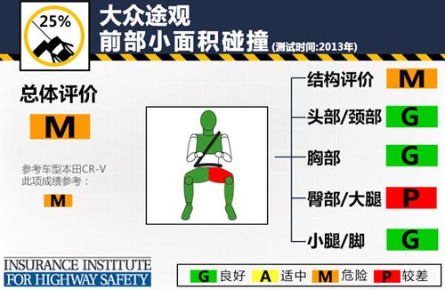本次測(cè)試途觀的總體評(píng)價(jià)為“G”(良好),在5大項(xiàng)測(cè)試中,正面40%碰撞測(cè)試、側(cè)面碰撞測(cè)試、頂部碰撞測(cè)試以及頸部保護(hù)測(cè)試這4大項(xiàng)總成績(jī)均為最高級(jí)別“G”(良好)。正面25%測(cè)試成績(jī)則為“M”(危險(xiǎn)),在最嚴(yán)苛的小面積碰撞測(cè)試中,模擬駕駛員假人的左側(cè)骨盆有受到嚴(yán)重傷害的風(fēng)險(xiǎn)。我們此次選擇的參考車(chē)型是本田CR-V,此車(chē)小面積測(cè)試總成績(jī)與途觀一致,同為“M”(危險(xiǎn)),模擬駕駛員假人的左側(cè)小腿/腳有受到傷害的風(fēng)險(xiǎn)。兩車(chē)均應(yīng)加強(qiáng)在嚴(yán)苛的25%正面碰撞測(cè)試中對(duì)車(chē)內(nèi)乘員的保護(hù)。
