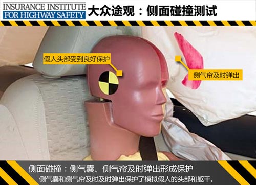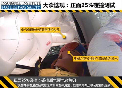 大眾途觀的小面積碰撞測(cè)試中的總體評(píng)價(jià)并不理想,成績(jī)僅為“M”(危險(xiǎn))。此車(chē)碰撞后A柱和車(chē)門(mén)嚴(yán)重變形,駕駛員生存空間受到嚴(yán)重入侵。受到撞擊后車(chē)門(mén)下部鉸鏈柱入侵至車(chē)內(nèi)空間有20cm之多,上部柱鉸柱和儀表板部件也向駕駛員生存空間移動(dòng)17-19cm。模擬駕駛員的假人左側(cè)骨盆有受到嚴(yán)重傷害的風(fēng)險(xiǎn)。碰撞后安全氣囊和側(cè)氣簾及時(shí)彈出,但安全帶的收緊程度較低導(dǎo)致模擬假人活動(dòng)范圍較大,頭部幾乎沒(méi)有接觸到安全氣囊之前就向左側(cè)滑出,但側(cè)氣簾的覆蓋面較大,有足夠延伸用來(lái)保護(hù)駕駛員的頭部不至碰撞車(chē)內(nèi)結(jié)構(gòu)而受傷害。