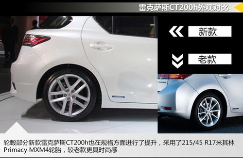 另外在尾部方面新車也進行了一些優化,保險杠較老款而言增配了重心更低的新款保險杠,增添了車身整體的運動型,尾部大燈形狀新款較老款而言并無變化,而霧燈部分則采用了新的“L”型設計。另外,輪轂的更新也讓新款CT200h運動感十足,采用了215/45 R17米其林Primacy MXM4輪胎,在規格方面也進行了提升。