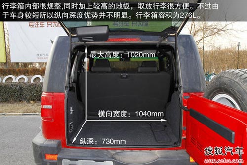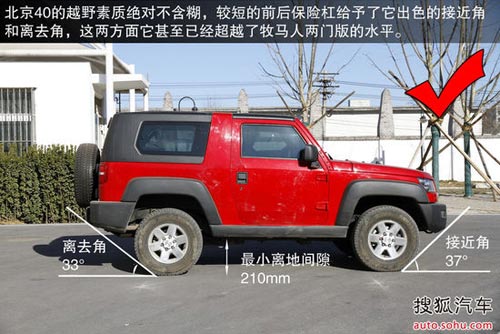 采用雙門設計,長度和軸距方面要比普通版越野車略短。不過1834mm的車身高度以及210mm的最小離地間隙均在同級車中有優勢。而說到接近角和離去角這樣的數據,北京40甚至已經超越了牧馬人兩門版的水平。