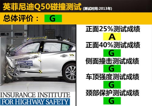 英菲尼迪采用全新命名后的首款轎車Q50進入國內的時間已進入倒計時,通過此車在美國這次碰撞測試,使我們進一步了解了Q50在安全方面的表現。新車除正面25%碰撞測試外,其余各大項測試中均能取得良好成績,對車內乘員的保護都很充分到位。在嚴苛的小面積測試中,雖然總成績是較為理想的“A”(適中),但因模擬駕駛員假人的左小腿有受傷風險,所以還不能說車輛有完美的優異安全性能,相信英菲尼迪能夠研發更為安全的技術標準,使車內乘員在嚴苛的碰撞測試中能夠得到全面的保護。