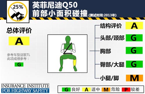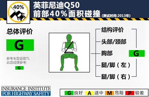 英菲尼迪Q50的正面碰撞測試不僅總成績為“G”(良好),且其中單項測試成績均為良好,車內人員身體各部位在碰撞中都受到良好的保護。謳歌TL此項測試的總成績和各項成績也都拿到了最高級別的“G”(良好)。