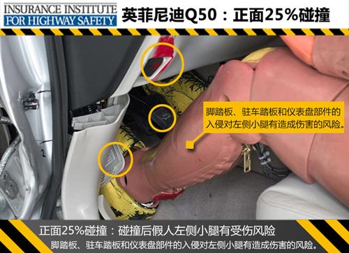 英菲尼迪Q50小面積碰撞測試的總體評價為“A”(適中),但乘員小腿/腳的安全項成績僅為“M”(危險)。撞擊中發動機艙吸收了大部分能量后潰縮 ,駕駛艙空間基本保持良好。但撞擊后駐車制動踏板向假人方向移動19 cm、擱腳踏板板侵入17 cm、儀表板部件入侵6-7 cm,這3處車內部件的入侵導致模擬駕駛員假人的左側小腿有受到傷害的可能。安全氣囊和側氣簾在碰撞中及時彈出,安全帶的收緊程度保持較好,假人頭部受到良好的保護。謳歌TL在正面25%碰撞測試中取得了優異的成績,車內乘員身體各部位均受到良好保護。