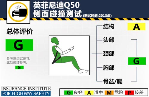 英菲尼迪Q50的側面碰撞測試總體評價為 “G(良好)”,此項測試中除了車身結構項成績為“A”(適中)外,乘員身體各部位安全小項Q50均取得了良好的成績,新車對車內人員身體各部位在側面碰撞中都有著充分的保護。謳歌TL此項測試中模擬駕駛員假人的胸部有受到傷害的風險。