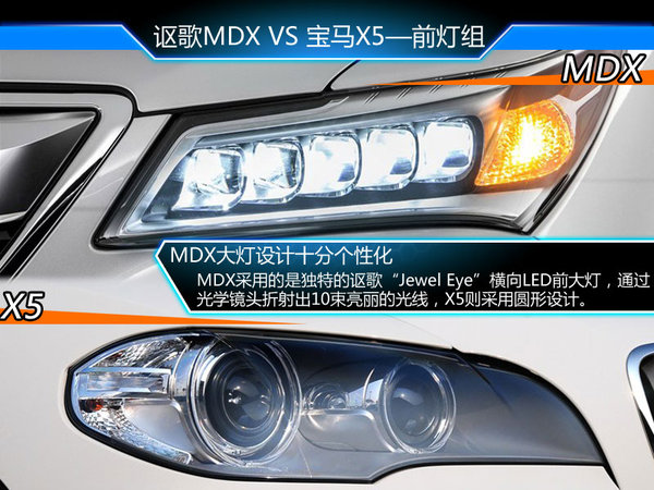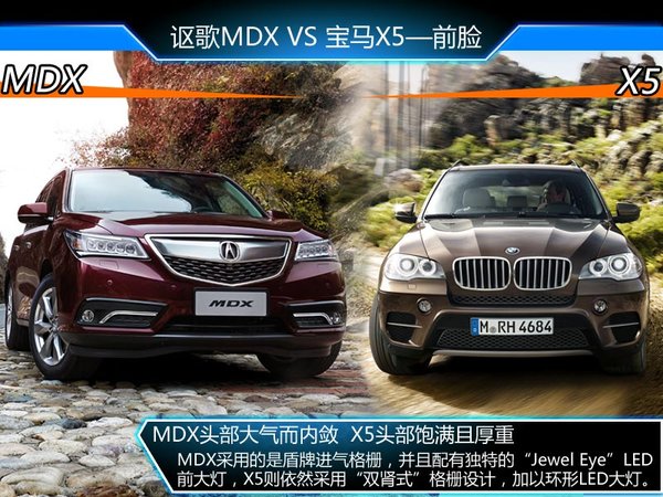 首先從外觀上來看,謳歌全新MDX和寶馬X5造型均顯得非常時尚,MDX盾牌形狀的格柵設計以及大面積的鍍鉻飾條十分搶眼,尤其是采用謳歌獨特Jewel Eye 5眼光學照射系統的前燈組,充滿動感的同時顯得“炯炯有神”; 寶馬X5的“雙腎式”進氣格柵早已獨樹一幟,雙圓大燈與進氣格柵相連接,不規則造型的“天使眼”看上去也更加有型。