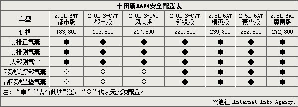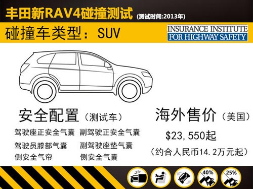 參加本次碰撞測試的車型為美版RAV4,海外售價折合人民幣約14.2萬元起,測試車輛配備了正面雙氣囊、前排側氣囊、頭部側氣簾以及駕駛座膝部氣囊和副駕駛座墊氣囊,總體來說在安全氣囊的數量上還是占優勢的。國產新RAV4在氣囊配備方面,前排正氣囊、前排側氣囊和頭部側氣簾是全系的標配,此外2.0LS-CVT和2.5L的3款車型還配有駕駛座膝部安全氣囊和副駕駛坐墊安全氣囊,新RAV4在氣囊數量和形式上均優于國內同級別SUV車型。