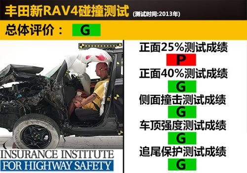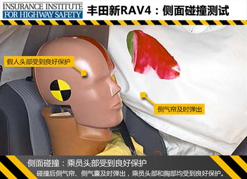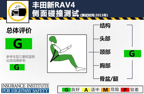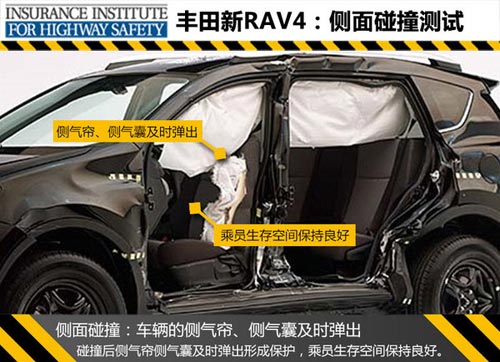 在側面碰撞測試中,新RAV4的側氣囊和側氣簾及時彈出,對假人的頭部形成了良好的保護。撞擊后車內乘員的生存空間保持完好,模擬假人身軀其他部均受到充分的保護。新RAV4的側撞全部各項成績均為“G”(良好),參考車型三菱歐藍德這項測試總成績以及乘員身體安全的各項成績均為“G”(良好),此車在正面40%碰撞測試中對車內人員的保護同樣全面到位。
