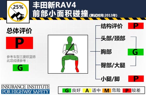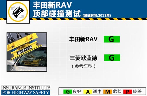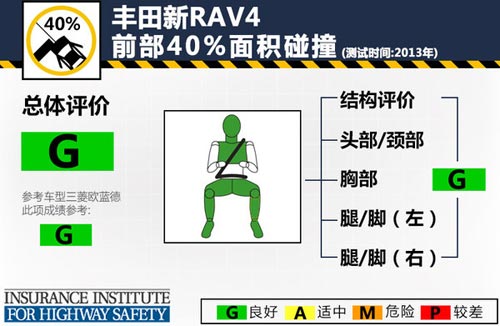 豐田新RAV4的正面40%碰撞測試總成績為 “G(良好)”,其中各項成績也均為良好,在這項測試中,新車對車內人員的保護充足且到位。三菱歐藍德這項測試各項成績均為“G”(良好),此車在正面40%碰撞測試中對車內人員的保護同樣全面到位。