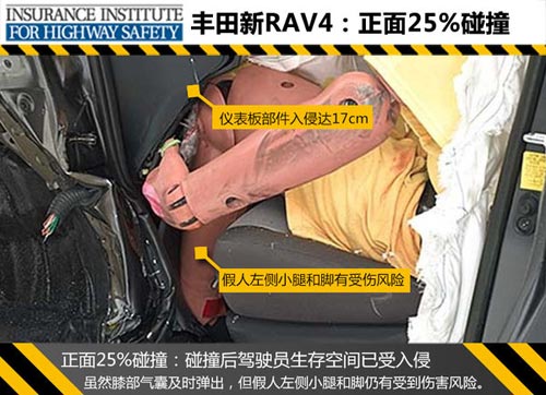 在最為嚴苛的小面積碰撞測試中,豐田新RAV4的發動機艙雖然吸收了大部分撞擊能量,但駕駛艙受到撞擊后仍受到嚴重的結構入侵。車門鉸鏈柱和儀表板部件均不同程度入侵到駕駛員生存空間,其中上下鉸鏈柱分別入侵達21cm和31cm,儀表板部件向下入侵17cm,模擬駕駛員假人的左腳已被擠壓,同時門鉸鏈柱和儀表板結構的入侵也使左側小腿有較高的受傷風險。而三菱歐藍德在撞擊后駕駛員生存空間保持良好狀態,車門鉸鏈柱最大入侵10-16cm、儀表板部件入侵12cm,模擬駕駛員假人在碰撞后狀態良好。