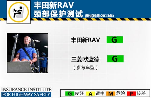 頂部碰撞主要測試車輛發生翻滾時車型結構的變化,成績可反映出側翻時車身結構的安全性,在這項測試中豐田新RAV4和三菱歐藍德均的成績均為“G(良好)”,可以為車內乘員提供充分的保護。頸部保護測試是模擬追尾碰撞時車輛座椅和頭枕對車內乘員頸部的保護,2車的測試成績均為良好,車輛的座椅和頭枕均可以為車內乘員提供足夠的防護,避免頸椎過度屈伸的損傷。