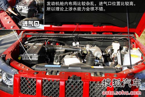 發(fā)動(dòng)機(jī)艙內(nèi)布局比較雜亂,不過上部大面積的隔音棉還是很厚道的。北京40的進(jìn)氣口位置比較高,基本與發(fā)動(dòng)機(jī)艙蓋同高,加上較高的底盤高度,所以這樣的設(shè)計(jì)會(huì)給它帶來很不錯(cuò)的涉水基礎(chǔ)。