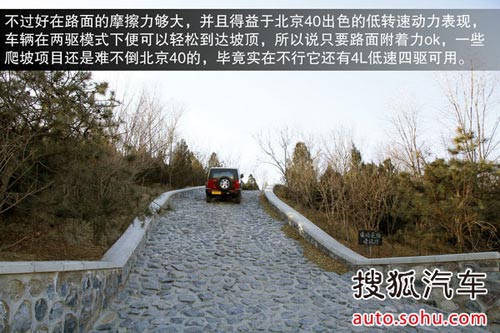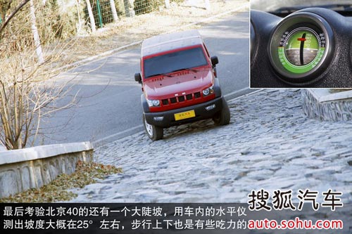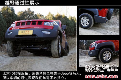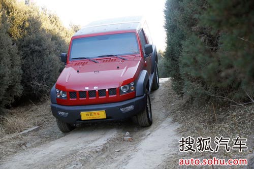 在越野測(cè)試中,場(chǎng)地內(nèi)還有一個(gè)較深的土坑,這會(huì)對(duì)車輛的接近角以及離去角有著很大的考驗(yàn),不過要知道北京40在這兩項(xiàng)上是完全超越Jeep牧馬人的,所以在下坑之前我們還是比較有底氣的,事實(shí)證明北京40還是可以輕松面對(duì)這些陡坡的。