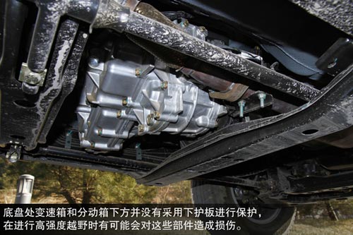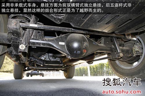 北京40采用硬派越野車慣用的非承載式車身,懸掛方面為前雙橫臂式獨(dú)立懸掛,后五連桿式非獨(dú)立懸掛。這樣的組合形式正是為了越野而生的,不過底盤處變速箱和分動(dòng)箱下方并沒有采用下護(hù)板進(jìn)行保護(hù),所以在進(jìn)行高強(qiáng)度越野時(shí)所產(chǎn)生的托底有可能會(huì)對(duì)這些部件造成損傷。