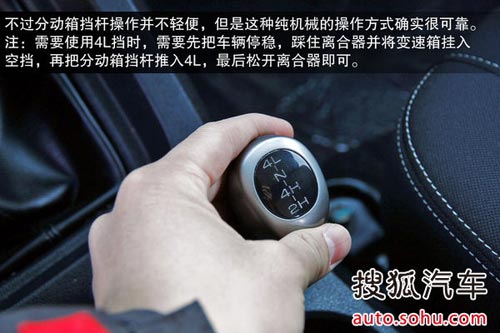 不過分動(dòng)箱擋桿操作并不輕便,需要使用較大力氣才能掛入相應(yīng)擋位,但是這種純機(jī)械的操作方式確實(shí)很可靠。注:需要使用4L擋時(shí),需要先把車輛停穩(wěn),踩住離合器并將變速箱掛入空擋,再把分動(dòng)箱擋桿推入4L,最后松開離合器即可。