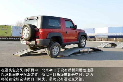 越野之前我們首先對(duì)它進(jìn)行了交叉軸測(cè)試,看看這臺(tái)沒有配備后橋限滑差速器的北京40能否發(fā)生奇跡通過交叉軸測(cè)試。在饅頭包交叉軸項(xiàng)目中,北京40還是和預(yù)想的一樣,由于輪間沒有任何限滑裝置,所以當(dāng)對(duì)角線車輪懸空時(shí),動(dòng)力將隨著輪胎空轉(zhuǎn)而白白流失,最終沒有通過交叉軸。