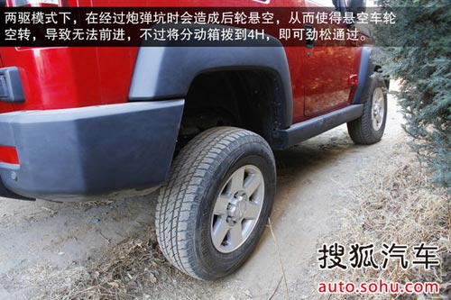 不過兩驅(qū)模式下,會(huì)在經(jīng)過炮彈坑時(shí)造成后輪懸空,從而使得懸空車輪空轉(zhuǎn),導(dǎo)致無法前進(jìn),不過將分動(dòng)箱撥到4H,即可勁松通過。整體來看,北京40盡管低配車型沒有后橋限滑差速器,但是應(yīng)付像今天這樣的越野項(xiàng)目還是很輕松的,它甚至可以做到不用借助4L低速四驅(qū),看來這個(gè)硬漢確實(shí)做到了表里如一,沒有令人失望。