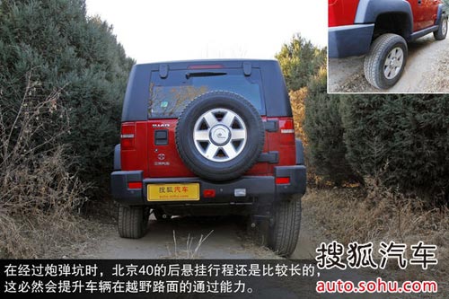 在經(jīng)過炮彈坑時(shí),我們可以看出,北京40的后懸掛行程還是比較長(zhǎng)的,在輕度越野時(shí)后輪基本可以一直保持與地面接觸,所以這必然會(huì)提升車輛在越野路面的通過能力。