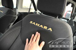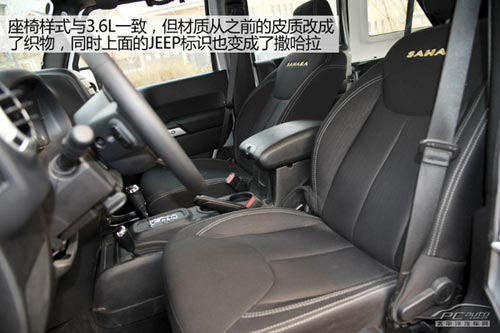 座椅樣式雖然沒有太大的變動,但在材質上由之前的真皮變成了織物,因此坐上去感覺要比3.6L版本柔軟度更好,同時LOGO也有之前Jeep變成了Sahara。