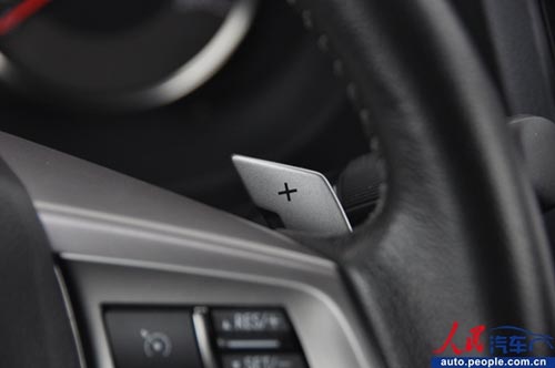 方向盤上的設計看似復雜,但這上邊的按鈕全是日常最常用的,所以無需擔心自己不小心碰到了什么而導致車輛正常行駛。方向盤握環較細,而且真皮包裹也偏硬,好在換檔撥片的設計和手感尚佳,彌補了方向盤握感的不足。