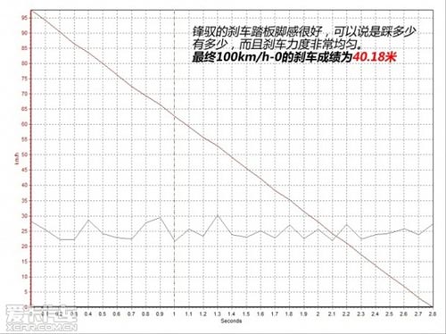 在100km/h-0的剎車測(cè)試中,鋒馭的剎車踏板腳感很好,可以說是踩多少有多少,而且剎車力度非常均勻。另外較硬的懸掛對(duì)于車身的支撐到位,使得鋒馭在全力剎車時(shí)保持了良好的車身姿態(tài)。