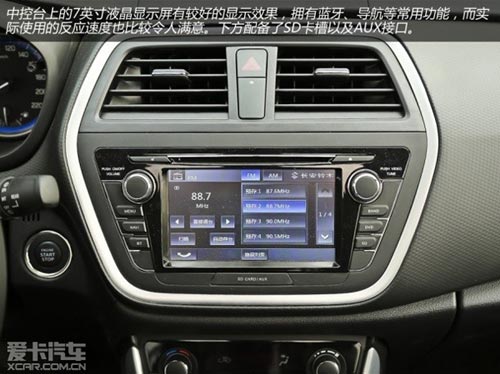 內飾設計比較有層次感,但卻并不復雜,對于第一次上手的駕駛員來說沒有任何難度。中控臺的做工較為出色,中間部分使用了大面積搪塑工藝的軟性材質進行覆蓋。中控臺上的7英寸液晶顯示屏也有較好的顯示效果及反應速度,另外無論是多媒體系統還是空調面板的各個旋鈕按鍵都有比較出色的觸感,在這個級別的車型中能擁有如此做工還是值得表揚的。