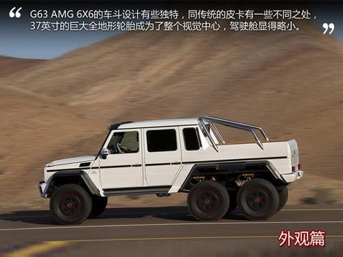 外形來看,G63 AMG 6x6同普通G級沒有太大區別,依舊是棱角分明,幾十年的傳承并沒有讓人感到視覺疲勞,只是車斗的設計有一些獨特,同傳統的皮卡有一些不同之處,而37英寸的巨大全地形輪胎成為了整個視覺中心,駕駛艙就顯得有點小了。