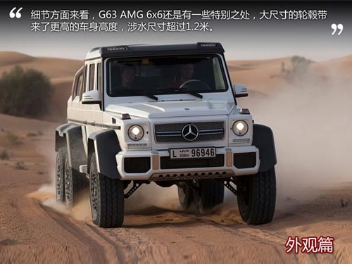 細節方面來看,G63 AMG 6x6還是有一些特別之處,大尺寸的輪轂帶來了更高的車身高度,涉水尺寸超過1.2米。