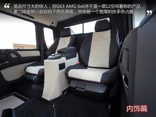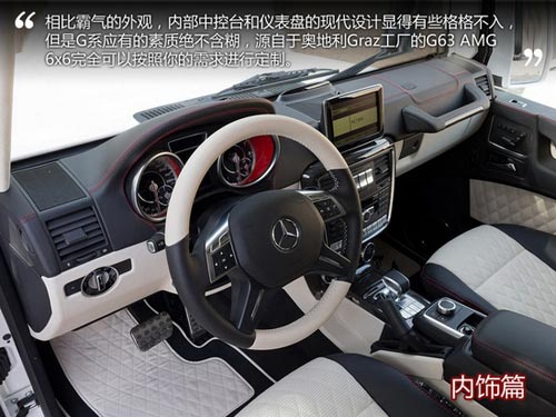 相比霸氣的外觀,內飾自然需要與眾不同才能博得眼球,穩重的配色和傳承的布局不用多說,中控臺和儀表盤的現代化設計同外形似乎有些格格不入,但是G系列應有的素質絕不含糊:源自于奧地利Graz工廠的G63 AMG 6x6完全可以按照你的需求進行定制,各種顏色的內飾和面料都可以成為你的選擇。