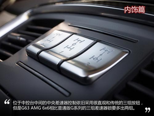 位于中控臺中間的中央差速器控制依舊采用很直觀和傳統的三組按鈕,但是G63 AMG 6x6相比普通版G系列的三組差速器鎖要多出兩組,因此要通過三個按鈕來搞明白這么設置差速器還真得耗費點腦子。