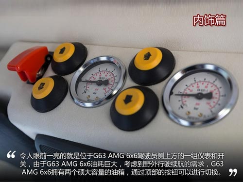 令人眼前一亮的就是位于G63 AMG 6x6駕駛員側上方的一組儀表和開關,由于G63 AMG 6x6的油耗巨大,并且考慮到野外續航的需求,G63 AMG 6x6擁有兩個碩大容量的油箱,通過頂部的按鈕可以進行切換。