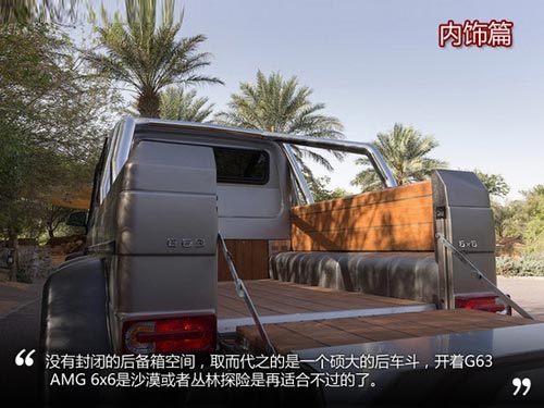 雖說尺寸大的驚人,但是G63 AMG 6x6還真不是一款以空間著稱的產品,第二排座椅只能容納下兩名乘客,中央被一個寬厚的扶手所占據,沒有封閉的后備箱空間,取而代之的是一個碩大的后車斗,開著G63 AMG 6x6是沙漠或者叢林探險是再適合不過的了。