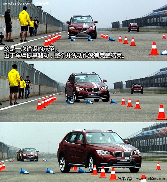 首先進行的是寶馬X1的緊急并線體驗。我們所需要做的駕駛動作說起來很簡單:自出發點全油門起步,在剎車點假設前方出現障礙物全力制動并向左側車道緊急轉向避讓。這在汽車探索的專業測試中我們也有做過,不過此次體驗不同的是,寶馬X1的緊急并線在轉向中不需要松開剎車,而是在全力制動以及轉向避讓過程中持續制動進行轉向動作,這讓筆者在初次體驗過程中很不適應。