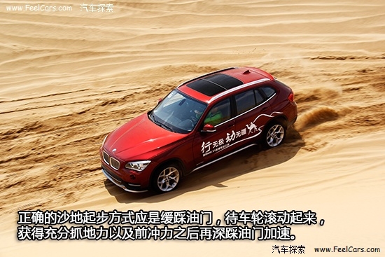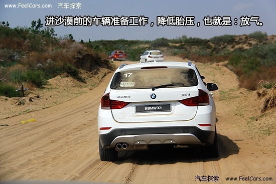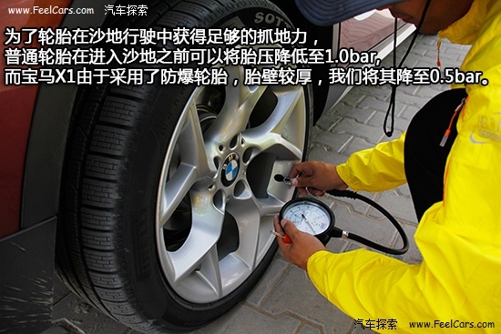 也許熟悉沙漠駕駛的網友們都知道,在進入沙漠駕駛之前,我們需要將駕駛車輛的胎壓降低,也就是放掉一部分輪胎中的空氣,增加輪胎與地面的接觸面積,幫助車輛獲得更多的抓地力。普通車輛在進入沙漠前需要將胎壓降低至1.0bar,再低可能會導致輪胎與輪轂出現脫圈的危險。而由于我們此次試駕的寶馬X1使用了防爆輪胎,在0胎壓情況下也可以在80公里/小時以內行駛近80公里的距離,因此我們在進入沙漠之前,將胎壓降低至0.5bar。此外,為了獲得更多的動力輸出,我們在進入沙漠之前會將車身穩定系統完全關閉,以避免系統偵測到打滑動作后進行制動,浪費車輛動力。另外,沙漠駕駛中的上下車也有一個小竅門,就是盡量保持單個車門的關閉,避免同時打開兩個車門之后在車內形成對流,卷進沙子。