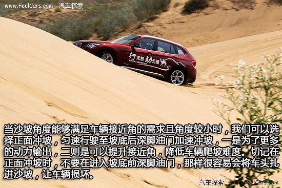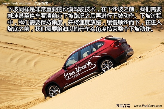 在沙坡登頂之后,如何下坡也是一項沙漠駕駛技術。在下坡之前,我們需要提前查看前方路況,低速駛向坡口。由于流沙滑落的特性,沙坡在形成時不會出現非常銳的角度,這也讓車輛不至于直接墜落。不過在比較極端的情況下,我們仍然需要下車查看,以降低風險。下坡過程中,我們需要讓車輛保持角度,速度放慢,緩緩的滑下沙丘,在即將行駛到沙丘底部時,我們需要給油以抬升車頭讓車輛更輕松的完成整個下坡動作。而對于我們此次試駕的寶馬X1 xDrive28i,由于配備了陡坡緩降系統,在下坡過程中我們只需要松開剎車,系統就會按照此前設定的速度緩慢駛下沙坡,更加輕松。