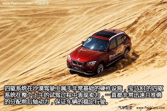 寶馬X1 xDrive28i在此次的沙漠試駕中表現出色,由于在沙漠駕駛之前我們關閉了車身穩定系統,再加上沙面容易讓車輪出現打滑情況,因此在車輛的行駛過程中,駕駛者能夠在車內明顯感覺到四驅系統努力分配著車輛前后軸的動力輸出,保證車輛在沙面中的穩定行駛。另外加上自動差速制動系統的幫助,這套系統能夠檢測驅動輪之間出現較大轉速差時,對打滑車輪施加制動力,轉而讓有附著力的車輪得到更多的動力輸出,避免動力白白浪費在打滑的車輪上。當然,寶馬X1接近角,離去角以及通過角的寬泛設計也是寶馬X1在此次沙漠試駕中表現出色的不可缺少的硬件設施。