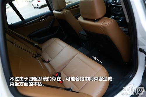 由于軸距沒有太大變化,所以在前后排的空間方面,寶馬X1和進口車型并沒有太大區別,比普通A級車空間略微寬敞一些。不過由于四驅系統的存在,所以后排地板中央有一個突起,可能會給中間乘客造成乘坐方面的不適。真皮座椅的舒適性尚可,前排全部為電動調節,并且配備了腰部支撐調節,并且帶有座椅加熱和兩組記憶模式。