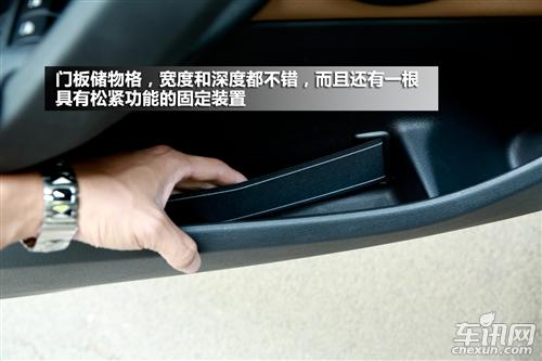 一般的豪華車型對于實用性的細節并不是很高,但這點在國產寶馬X1身上并不存在,因為內部的儲物格設計非常實用,比較有代表性的就是門板儲物格,寬度和深度都不錯,而且還有一根具有松緊功能的固定裝置。后排椅具備中央扶手,扶手中有隱藏式杯架2個。