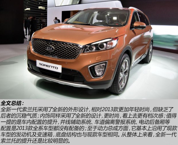 在我的印象里面,起亞索蘭托是一款性價比不錯的進口SUV車型。自2009年進入國內銷售以后,它憑借著原裝進口的身份、豐富的配置以及寬敞的乘坐空間等特點積累了不少忠實的用戶。在2014巴黎車展上,起亞汽車帶來了索蘭托的全新一代車型。除了外形、內飾設計的改變外,它的車身尺寸、配置等都有相應的升級。