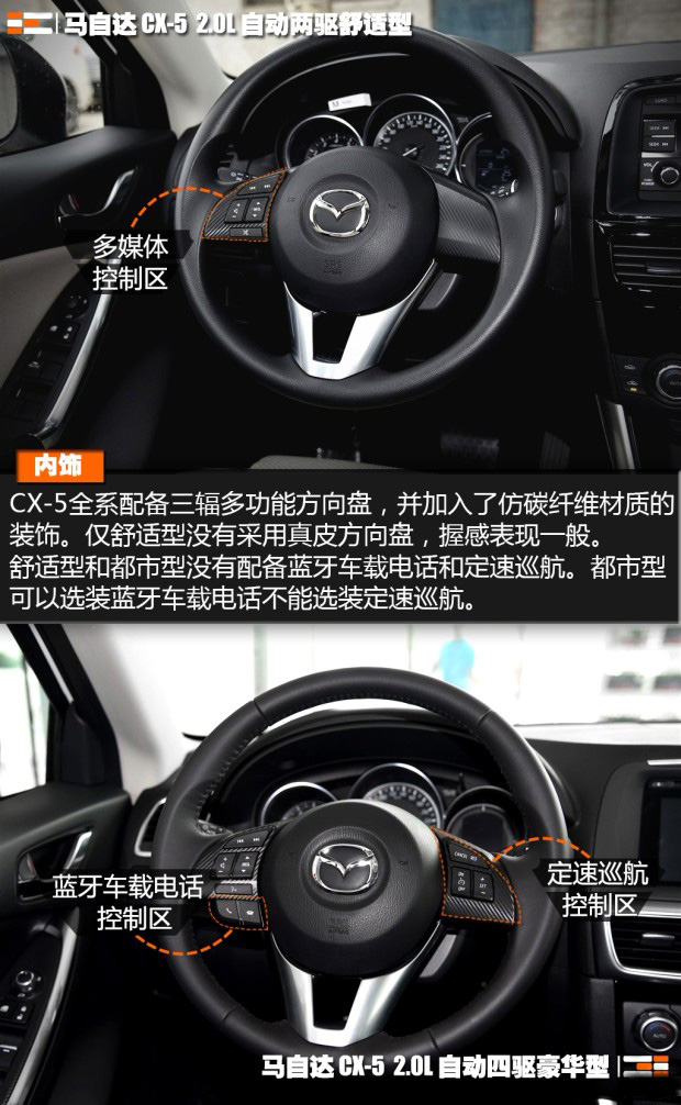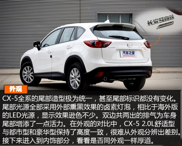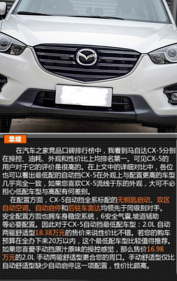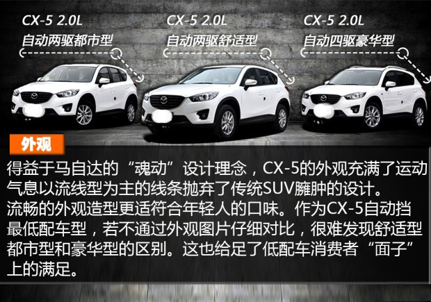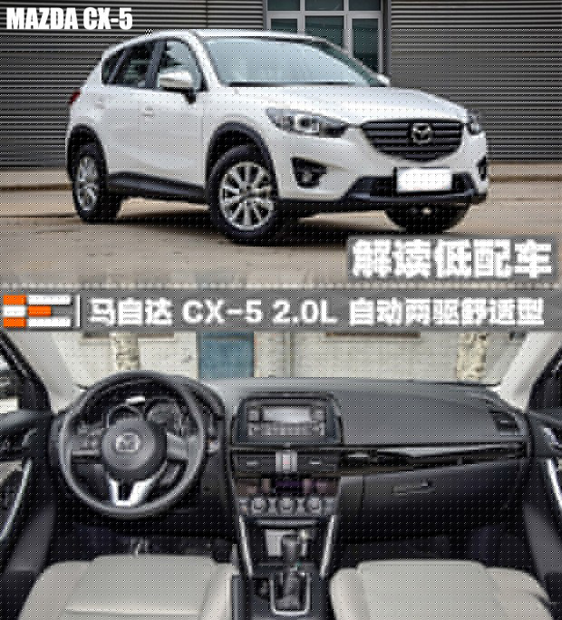 “我預算全辦下來20萬,想買輛SUV,你看哪款值得推薦”。這是我最近被問到最多的問題。作為一名汽車編輯,對于這個問題我還真的不好回答,因為可選擇的太多了。從這些購車咨詢中,也不難看出對于消費者來說SUV的誘惑力有多大。今天我就帶大家看一輛20萬以內能開回家的SUV車型:馬自達CX-5 2015款 2.0L 自動兩驅舒適型(官方指導價18.38萬元)看看它是否符合您的預期。作為馬自達CX-5自動擋的最低配車型它18.38萬元的售價性價比怎么樣?與比它配置更高的2015款 2.0L 自動兩驅都市型(官方指導價:19.08萬元)和2.0L 自動四驅豪華型(官方指導價:20.98萬元)又有怎樣的差異呢?看完這篇解讀低配車或許您心中會有個答案。(注:文章內將2015款 2.0L 自動兩驅舒適型簡稱舒適型、自動兩驅都市型簡稱都市型、自動四驅豪華型簡稱豪華型)
