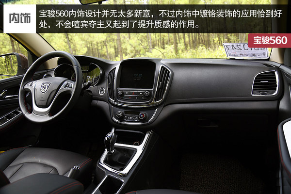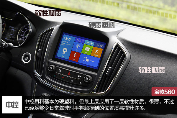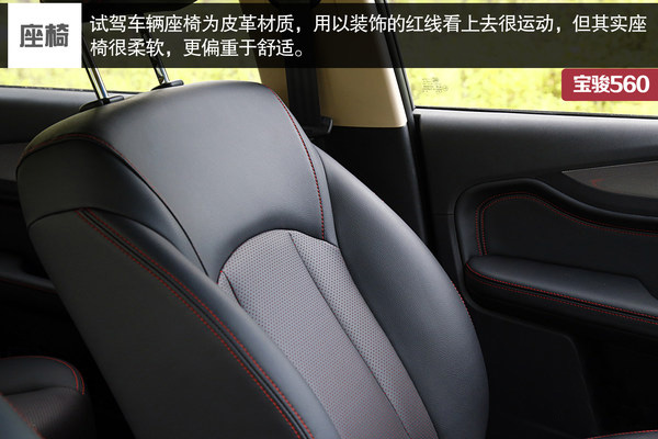 寶駿560內飾造型沒必要再做解讀,不過對于全黑內飾,幾處鍍鉻裝飾運用值得贊揚,提升質感同時不喧賓奪主。雖然中控用料基本為硬塑料,但最上層應用了一層軟性材質,試駕車輛方向盤非常顯質感,采用真皮包裹并輔以紅色縫線處理,無論手感及材質都比低配車型的普通發泡工藝強上太多。