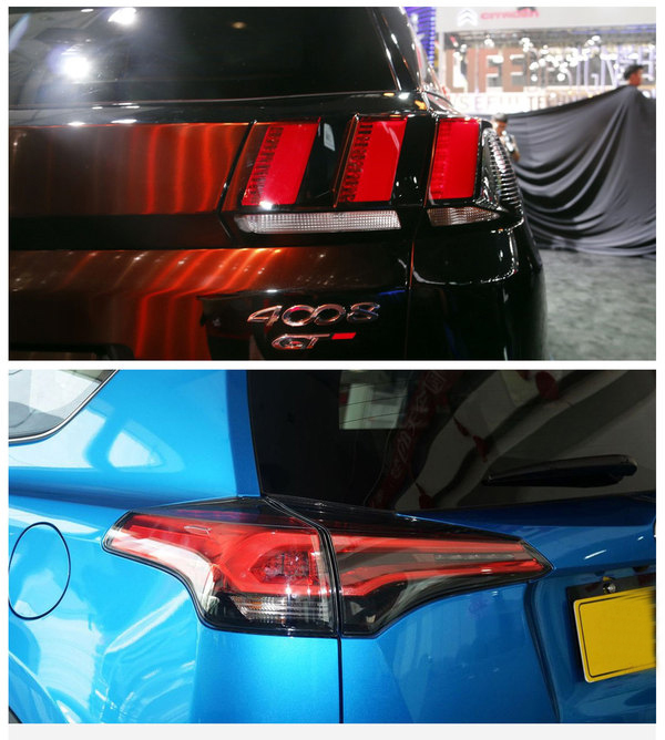 4008尾部設(shè)計同樣運用了標(biāo)致最新設(shè)計語言,貫穿式的黑色飾板與兩側(cè)的獅爪尾燈相連,同時懸浮式車頂造型也讓新車看起來非常時尚。榮放的尾部變化并不大,僅在下包圍的配色上和排氣管的裝飾上進行了調(diào)整。