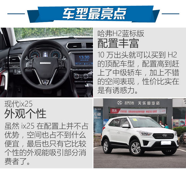 對比的兩款車選擇都是12萬左右的車款,H2可以買到頂配而ix25只能買到最低配,而且從市場價格來看,兩車的優惠幅度也很相似。所以就對比這兩個配置吧。