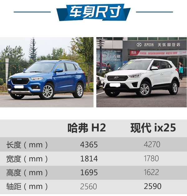 對比的兩款車選擇都是12萬左右的車款,H2可以買到頂配而ix25只能買到最低配,而且從市場價格來看,兩車的優惠幅度也很相似,所以,用低配比頂配自然配置上是輸的很慘,而且空間H2也要更大,除了做工更細致外觀更個性外,我當然是推薦購買H2藍標版。